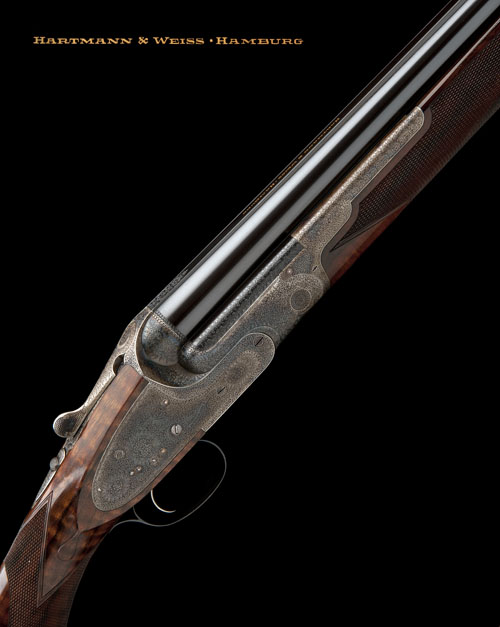 29in. nitro reproved chopperlump barrels (in 2012) with tapered solid border engraved rib and side-ribs, the breech end gold-inlaid 'HARTMANN & WEISS . HAMBURG', 2 3/4in. chambers, bored approx. 1/2 and 1/4 choke, hold-open toplever, manual safety with gold-inlaid 'SAFE' detail, cocking-indicators, non-selective single trigger, the action, lockplates and furniture exquisitely engraved with fine floral bouquets and acanthus scrollwork, the makers name inscribed in a scrolling banner, retaining virtually full original colour-hardening and finish, 14 3/4in. highly-figured semi-pistolgrip stock, weight 7lb. 8oz., in its lightweight leather case with canvas and leather outer