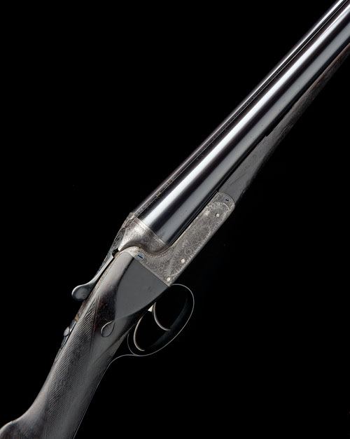 30in. nitro barrels, rib engraved 'WILLIAM EVANS. 63, PALL MALL. ST. JAMES'S. LONDON.', and gold-inlaid '1', 2 1/2in. chambers, bored approx. true cyl. and 1/4 choke, treble-grip action with removable striker discs, toplever gold-inlaid '1', automatic safety with gold-inlaid 'SAFE' detail, intercepting sears, border and acanthus scroll engraving, retaining very slight traces of original colour-hardening, 14 5/8in. stock (some bruising) including 5/8in. wooden extension, fore-end with repairs, weight 6lb. 8oz., in a canvas case (damaged)