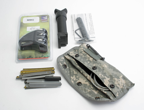 A GROUP OF ACCESSORIES FOR AN AR15 ASSAULT RIFLE,