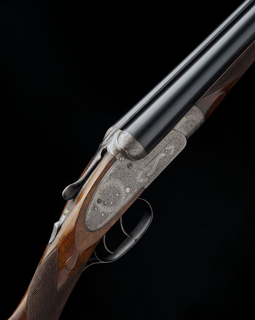 30in. nitro reproved blacked damascus barrels, rib engraved 'CHARLES INGRAM 18B RENFIELD STREET. GLASGOW.', 2 1/2in. chambers, bored approx. 1/4 and 3/4 choke, treble-grip action, carved fences, automatic safety with gold-inlaid 'SAFE' detail, gold-inlaid cocking-indicators, acanthus scroll engraving, brushed finish, 13 3/4in. figured replacement stock, weight 6lb. 10oz.