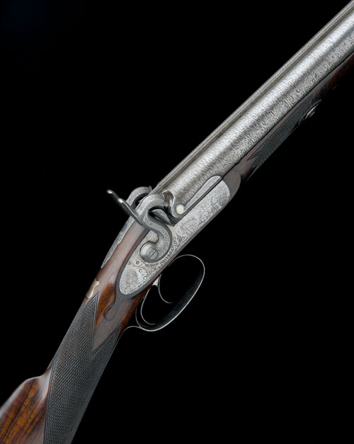 A 13-BORE PERCUSSION DOUBLE-BARRELLED SPORTING GUN, UNSIGNED, serial no. 1069,