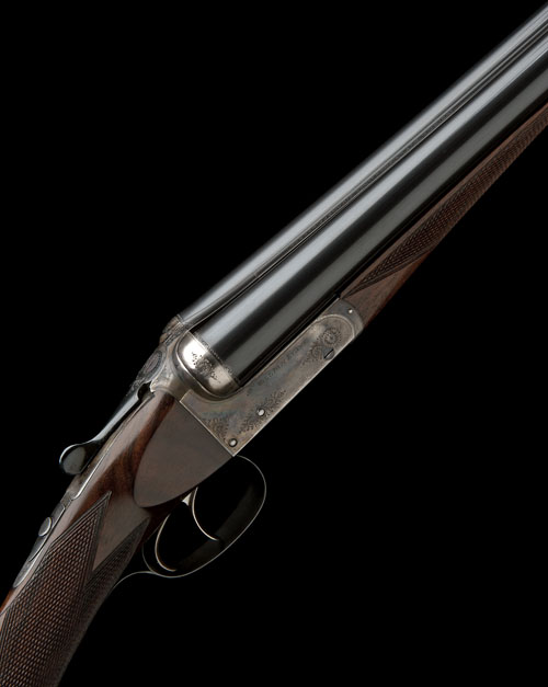 26 1/2in. nitro barrels, rib engraved 'WILLIAM EVANS. 63, PALL MALL, ST. JAMES'S, LONDON.', 2 1/2in. chambers, bored approx. true cyl. and imp. cyl. choke, treble-grip action with carved fences, automatic safety, border and partial scroll engraving, retaining traces of colour-hardening and finish, 14 3/4in. figured stock, cast off for central vision, including 7/8in. rubber recoil pad, weight 6lb. 6oz.