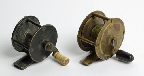 TWO SMALL BRASS FISHING WENCHES 1 x 2in., 1 x 1 3/4in. Estimate £30-40