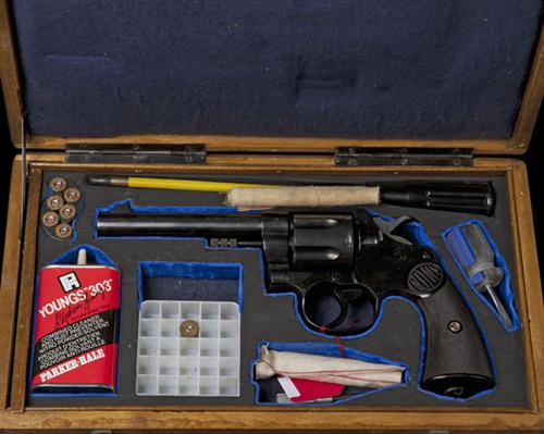 for 1915, converted from .455 for use with half-moon clips, blued 5 1/2in. sighted barrel, fluted cylinder, plain frame with the Colt trademark on the side-plate, chequered hard-rubber grips embossed with 'COLT' and lanyard swivel to heel, the whole refinished TOGETHER WITH a later wood storage case with a number of modern accessories