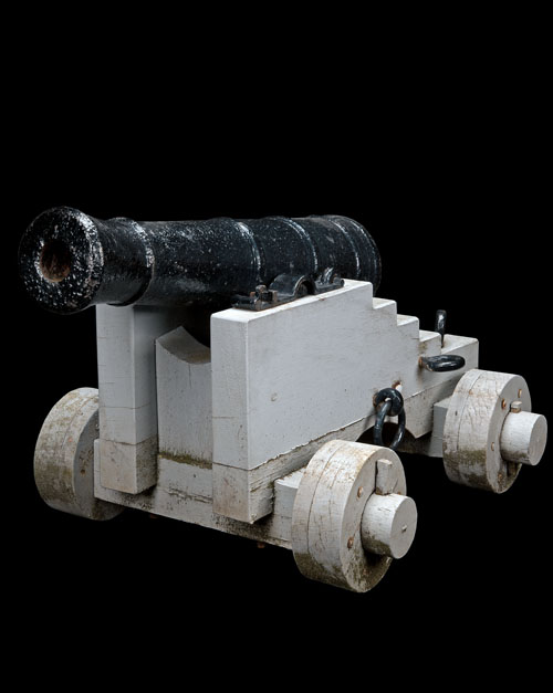 circa 1860, with re-painted (over corrosion) 30in. barrel including the cascabel, tapering banded barrel with flared muzzle, the whole mounted on a grey-painted oak naval trolley of later date but in scale