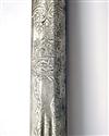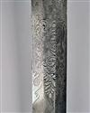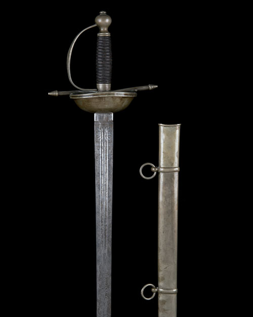 circa 1890, probably South American, with broad straight double-edged 36in. blade etched with foliage and scrolls for the first half of its length, the etching also including martial trophies and a shield with the legend 'LIBERTAD' beneath and a ribbon bearing the dates '19 DE APRIL DE 1810' and '5 DE JULIO DE 1811', twin central fullers for the first third of the blade, nickel bowl-guard with turned-back edge, possibly originally covered (small losses to edge), straight nickel cross-guard with bee-hive terminals, nickel 'D' shaped knuckle-bow and bulbous pommel, spirally ribbed leather grip TOGETHER WITH its original nickel scabbard with twin suspension rings (nickel tarnished throughout)