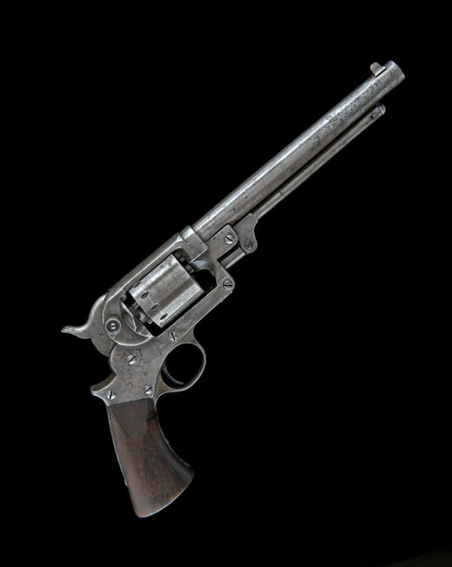 circa 1864, with round 8in. sighted barrel (some pitting), plain cylinder, plain hinged frame stamped 'STARR ARMS CO NEW-YORK', flared walnut smooth one-piece grip stamped with martial inspectors marks and '1 77', under-barrel loading lever, minimal traces of original finish