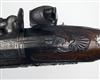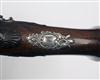 circa 1760, with swamped 9in. iron barrel (pitted and cleaned) signed on the top-flat 'P. GANDON, LONDON', border line engraved sighting plane, applied white-metal boat-shaped fore-sight, London proofs and makers mark 'PG' within an oval to the breech, banding and scroll engraving at the breech-end, solid engraved top-tang, border line carved and radiused lockplate signed 'P. GANDON', bridled rain-proof frizzen and pan with drain, border and scroll engraved hammer with broad sliding safe behind, walnut full-stock with tear-drops behind the plates and shell carving around the top-tang, silver rococco escutcheon (vacant), unusual silver short-tailed butt-cap relief embossed with martial and musical devices, the centre with a plumed hat and sabre, full pierced martial sideplate with a central cannon, iron trigger-guard and tang (worn, some loss to detail) and iron ramrod throat and thimble (missing ramrod)