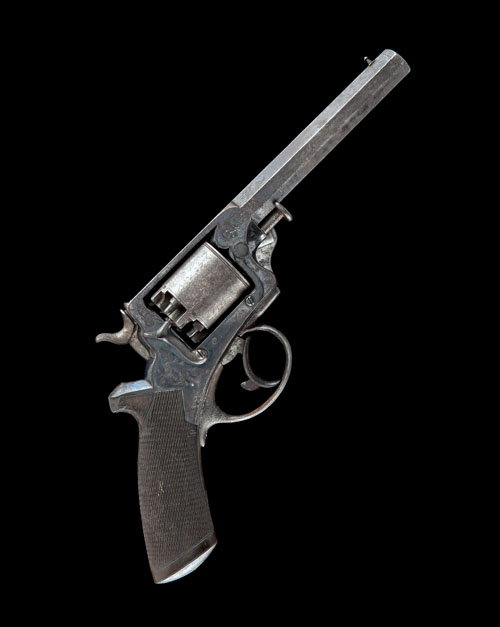 4th model, circa 1862, with blued 6in. octagonal barrel, engraved band at muzzle, dove-tailed barleycorn fore-sight, scroll engraving around barrel throat, the top-strap with rear standing sighting notch and signed 'JOHN HAYTON GRAHAM'S TOWN', plain border-line engraved cylinder with rope engraved front edge, border-line and scroll engraved frame, swinging cylinder lock on right hand side, 'TRANTERS PATENT' and the inspectors stamp 'HH' to left hand side of frame, chequered walnut one-piece grip (small loss near top), scroll engraved iron butt-cap, hinged border and scroll engraved rammer mounted to left hand side of frame and barrel, the whole with good traces of original finish (some pitting to trigger-guard bow)