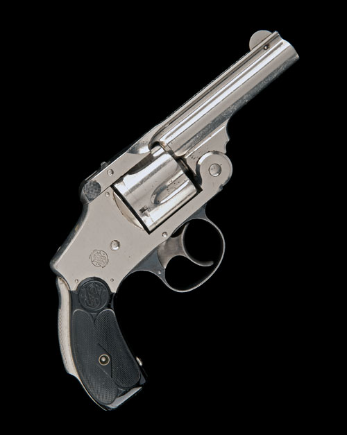 circa 1925, with 3 1/4in. sighted barrel, break-open auto ejecting frame with fluted cylinder, black hard-rubber chequered grips with 'Smith & Wesson' monogram, the backstrap with grip-safety, retaining the majority of its original nickel plate