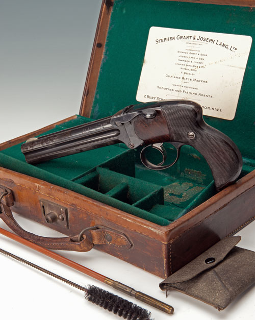for 1886, with 6in. barrel group, nickel-crescent fore-sight, standing notch rear-sight on the receiver, boxlock double-action only hammerless action with side-lever opening, chequered walnut birds-head semi-sawback grips (one with small chip at front corner), polished trigger and fair traces of original finish TOGETHER WITH its original leather covered travelling case, the interior lined and compartmented in green baize, the inner lid with 'STEPHEN GRANT & JOSEPH LANG LTD.' trade label and retaining a pull-through, cleaning rod and brush