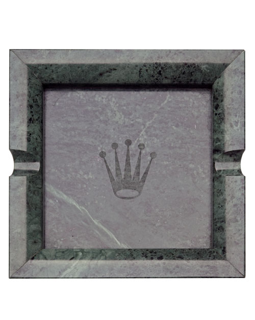 for use by Rolex watch dealers circa 1975, approximately 7 1/2in. square with etched Rolex crown trademark to the centre, in olive onyx with black veining