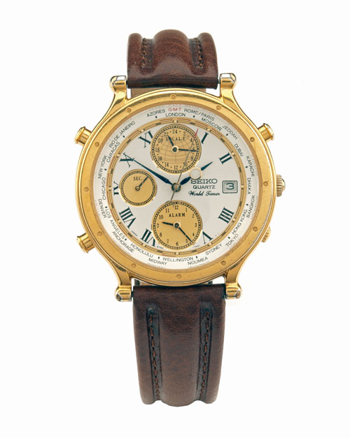 SEIKO, JAPAN A GENTLEMANS GOLD-PLATED QUARTZ MOVEMENT WORLD-TIME WRIST-WATCH WITH ALARM,
