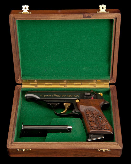 made to celebrate 50 years of the Walther PP in 1979, with blued 3 1/2in. barrel, blued slide inlaid in gold with '50 JAHRE WALTHER PP 1929-1979' on the left hand side with 'EW185 CAL 7.65mm' on the right, gold-plated trigger, hammer, magazine release and ejector claw, blued steel frame, walnut grips hand-carved with oak-leaves on a stippled ground, the whole appearing unfired, TOGETHER WITH its makers presentation wood box carved with the Walther logo and oak-leaves to the outer lid, the interior fitted and lined in green baize