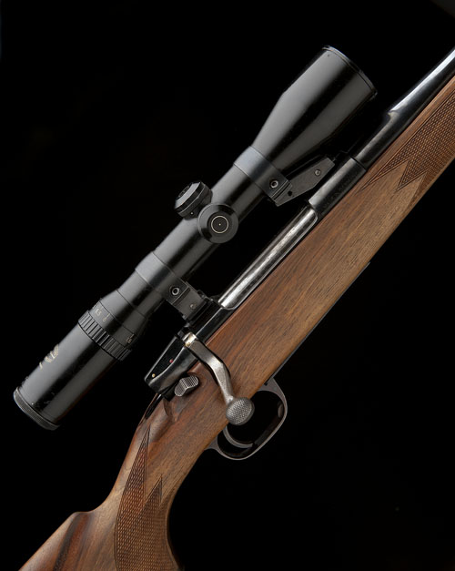 20 5/8in. nitro barrel with block-mounted folding open sights, ramp-mounted bead fore-sight, the receiver mounted with a Schmidt & Bender 1 1/2-6x telescopic sight, hinged straddle floorplate with push button release, pistolgrip stock with cheekpiece, sling eye, steel pistolgrip-cap, 14 1/2in. pull including 3/4in. rubber recoil pad