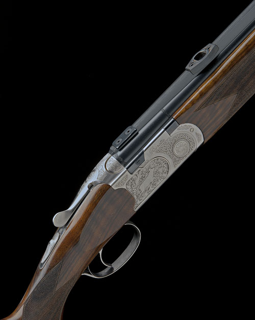 Cat. 3570, 24 1/16in. nitro barrels with matt sight rib, open sights and ramp-mounted high visibility fore-sight, the breech end with telescopic sight mount bases, hold-open toplever, manual safety, non-selective single trigger, scroll engraved silver action with game scenes of wild boar and stag in relief, 14in. figured hogsback pistolgrip stock with cheekpiece, sling eyes and including 1/2in. rubber recoil pad, weight 8lb. 3oz.
