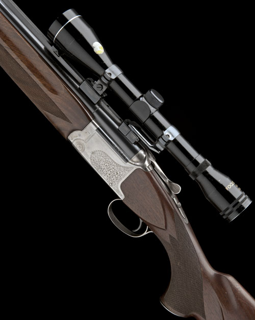 25 1/8in. nitro reproved barrels (in 2012) with raised matt rib, folding open sights and ramp-mounted bead fore-sight, the breech end mounted with a Focus Scope 4x40 telescopic sight in quickly-detachable mounts, 3in. shot chamber, multi-choke (no spares), shot barrel with ejector, rifle barrel with extractor, hold-open toplever, automatic safety with integral barrel selector switch, border and scroll engraving, bright finish, 14 1/4in. figured pistolgrip stock with cheekpiece, monte carlo comb, sling eyes, pistolgrip-cap and including 1/2in. rubber recoil pad, weight 9lb. 6oz.