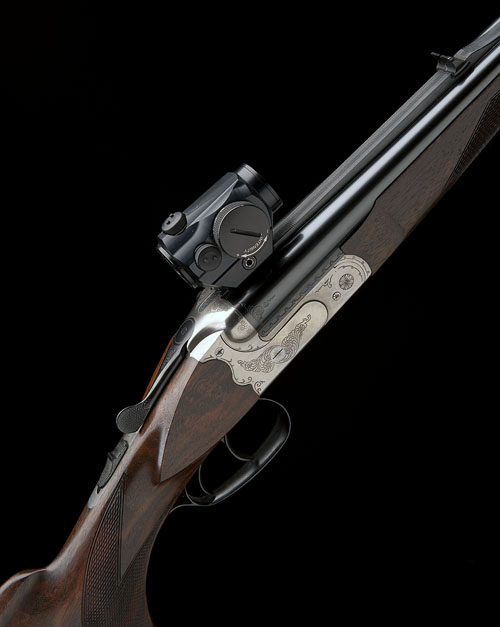 21 11/16in. nitro barrels with matt sight rib, open sights and ramped high visibility blade fore-sight, the breech end mounted with an Aimpoint Micro H-1 sight, left barrel engraved 'GEBR. MERKEL SUHL. MADE IN GERMANY', treble-grip scroll-back action, removable striker discs, automatic safety, partially engraved with scroll detailing, the underside with Carl Gustaf trademark, bright and blued finish, 14 1/2in. hogsback pistolgrip stock with cheekpiece, sling swivels, pistolgrip-cap and buttplate, weight 7lb. 4oz.