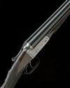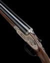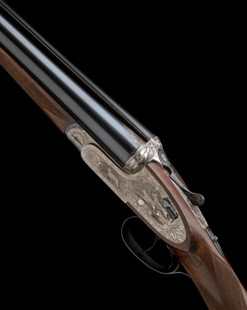 26 11/16in. nitro chopperlump barrels, 2 3/4in. chambers, bored approx. imp. cyl. and 1/4 choke, action with Holland & Holland style self-opening system, fences deeply carved in relief with mallard in flight, diminutive toplever carved with running hare, automatic safety, hand-detachable lockplates, articulated front trigger, rolled-edge triggerguard, action and lockplates carved in high relief with floral and scroll engraving with game scenes of deer hounds pursuing and bringing down stag, bright and blued finish overall, 14 1/4in. figured stock, weight 6lb. 12oz. (28in. barrels) and 6lb. 9oz. (26 11/16in. barrels), in a steel case with provision for one set of barrels