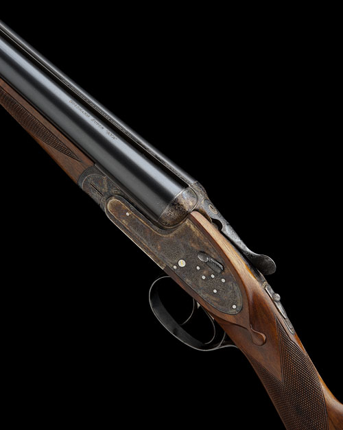 28in. nitro chopperlump barrels, left tube engraved 'GULDMANN SUPER AYA', 2 3/4in. chambers, bored approx. 1/4 and 1/2 choke, automatic safety with gold-inlaid 'SAFE' detail, removable striker discs, hand-detachable lockplates, gold-inlaid cocking-indicators, articulated front trigger, rolled-edge triggerguard, bouquet and scroll engraving, retaining virtually full original colour-hardening and finish, 14 3/4in. stock, weight 6lb. 12oz.