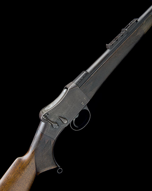 28in. round nitro barrel with open sights, three folding leaf sights for 200, 300 and 400 yards and adjustable iron sights up to 1200 yards, block-mounted bead fore-sight, the breech end engraved 'W.W. GREENER. 68. HAYMARKET. LONDON. S.W.', the knoxform marked 'AMMUNITION .303', action with basketweave engraving with crosshatch bordering, 14 1/2in. pistolgrip stock including steel buttplate (with trap), minor setting cracks at head, fore-end with horn finial, weight 7lb. 7oz.