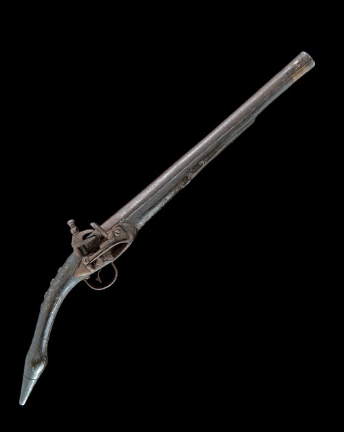 Albanian, circa 1790, with 13in. two-stage barrel (worn and corroded, missing nose-cap), iron lock (corroded) with dove-tailed striker-plate to frizzen, one-piece darkly patinated bronze or brass rat-tailed stock engraved with scrolls and arabesques, applied conical butt-cap, iron trigger-guard (corroded) and provision for rammer (missing)