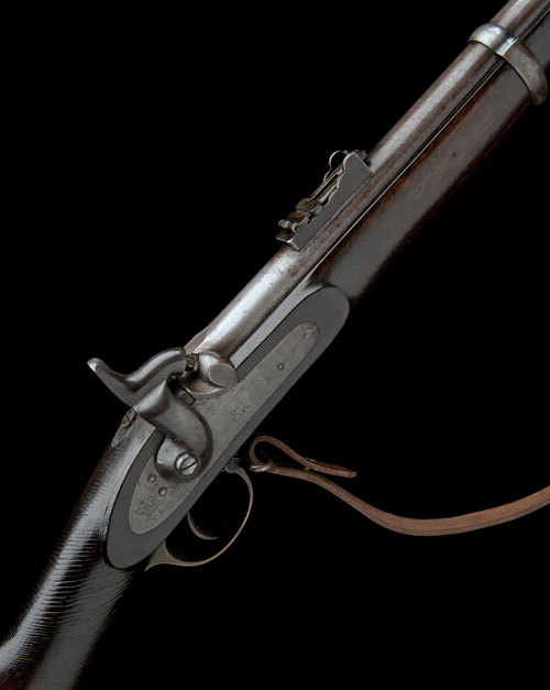 dated for 1863, with Murcott patent three-groove rifled 39in. barrel (traces of finish), block and blade fore-sight, elevating ladder rear-sight, plain signed and dated military style lock with 'V.R.' crown cypher to the tail (traces of colour), walnut three-quarter stock, amateur chequering at wrist, brass furniture, three iron barrel-bands, iron ramrod and later leather sling TOGETHER WITH a socket bayonet in poor condition (no scabbard) and some correspondence