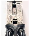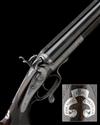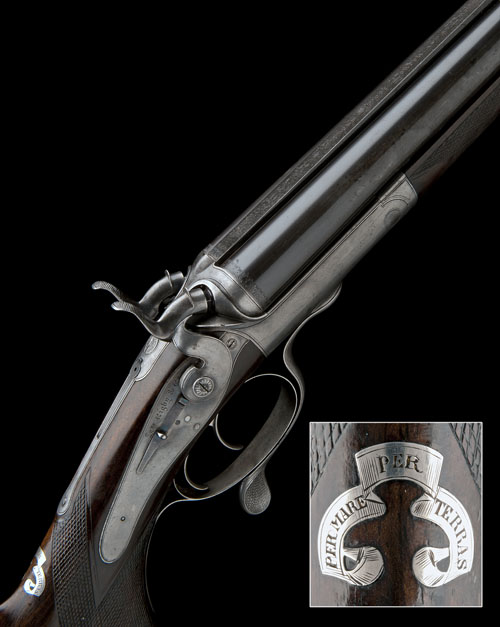 26in. black powder only barrels with raised matt rib, engraved in gothic script 'JNO RIGBY & CO. 72. ST. JAMES'S STREET. LONDON AND AT DUBLIN', open sights and folding leaf sight for 100 and 200 yards, bead fore-sight, Jones patent rotary-underlever, carved percussion fences, top strap with flush fitting folding peep sight, non-rebounding back-action locks with bolted hammers, border engraving overall, lockplates signed 'JNO. RIGBY & CO.' in gothic script, retaining very slight traces of original colour-hardening, 14 1/4in. boldly-figured pistolgrip stock, finely inset at the hand with a silver scrolling banner inscribed 'PER MARE PER TARRAS', carved horn pistolgrip-cap, acanthus scroll engraved sling button, chequered steel buttplate, with 3 1/2in. elongated oval blank white metal escutcheon, fore-end with cross pin release and finely carved horn finial, weight 9lb. 9oz.