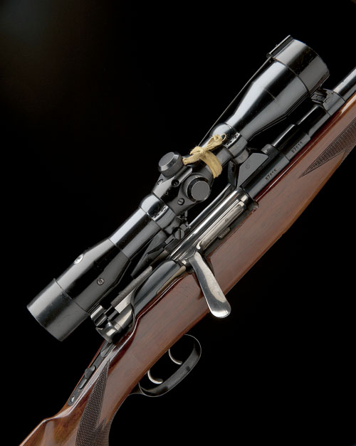 22in. nitro barrel with open sights and folding leaf sight, ramp-mounted bead fore-sight, the receiver mounted with a Nickel Supra 4x36 L81 E/S telescopic sight, blued finish, detachable magazine, set triggers, pistolgrip stock with dark wood finial and pistolgrip-cap, cheekpiece, monte carlo comb, sling swivels, 13 5/8in. pull including buttplate