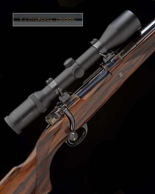 24 3/4in. nitro barrel gold-inlaid 'E.J. CHURCHILL. LONDON. 375 H&H MAGNUM', gold highlighted open sights with two folding leaf sights for 100, 200 and 300 yards, ramp-mounted bead fore-sight with fold over moonsight / protector, colour-hardened receiver (with thumb cutout) mounted with a Swarovski PVI-2 1,5-6x42 telescopic sight in engraved and serial numbered quickly-detachable mounts, colour-hardened and floral-engraved recoil block, Blackburn hinged straddle floorplate with push button release and engraved '375 H&H 4 CARTRIDGES', the receiver, floorplate and furniture with ropework border engraving, the bolt gold-inlaid with the serial number and with gold-inlaid 'SAFE' detail, highly-figured pistolgrip stock with cheekpiece, colour-hardened and engraved steel pistolgrip-cap with EJC monogram on trap, sling eyes, horn finial, 15in. pull including 1in. leather covered recoil pad