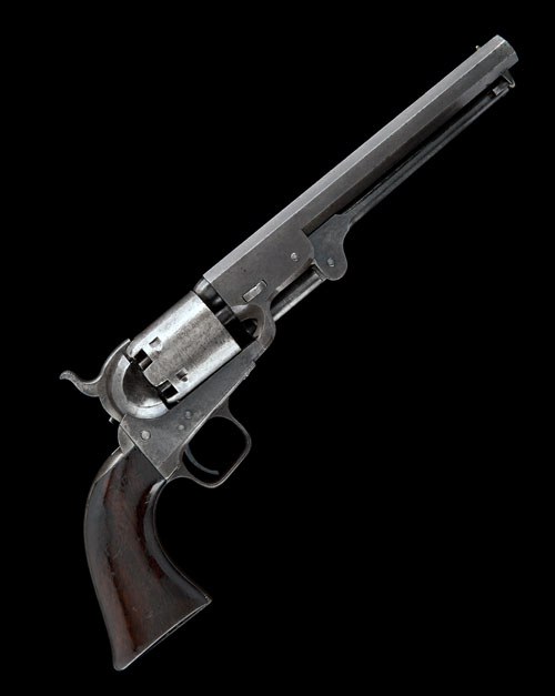for 1855, with 7 1/2in. octagonal barrel, the top-flat signed 'ADDRESS COL COLT LONDON', roll engraved cylinder scene, iron frame marked 'COLTS PATENT', iron grip-straps and trigger-guard, smooth one-piece walnut varnished grip and iron under-barrel rammer, no London proofs, traces of colour in sheltered areas