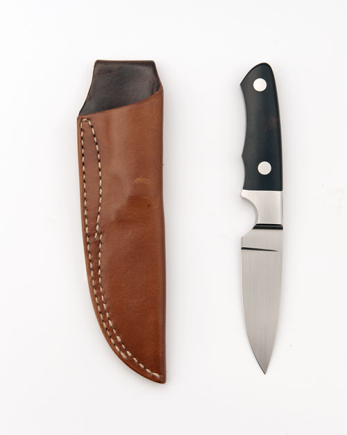 with 3 1/2in. drop-point blade, finger grooves, the front bolster engraved with the makers logo, tapered tang, cocobolo grip-scales, in its leather sheath