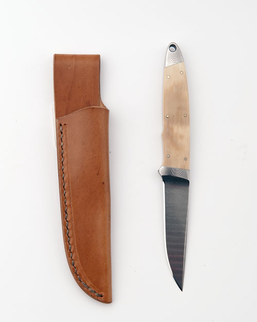 with 3 1/2in. damascus blade with swage, the tang engraved 'R.K. HEHN', antler grip-scales, pommel with lanyard hole, in its stitched tan leather sheath