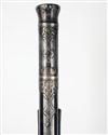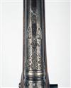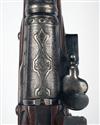 German, circa 1700, with a substantial fine five stage 42 3/4in barrel of Turkish origin, swamped muzzle with silver dots inlaid to the flats, polygonal for most of its length and inlaid with silver loops, lines and circles, possibly originally set with gemstones, and cut with silver panels decorated with arabesques in relief and smaller panels originally bordered in gold, applied silver fore-sight, standing notch iron rearsight, plain top-tang, heavily curved and radiused lockplate engraved with flowing scrolls and foliage terminating in the heads of mythical beasts and inhabited by a winged cherub aiming a blow-pipe at a seated monkey, walnut three-quarter stock carved around the barrel tang and ramrod channel, iron furniture and original iron tipped ramrod