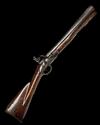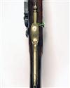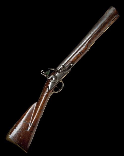 circa 1775, with heavy flaring 17 1/2in. iron barrel (makers details rubbed and illegible), solid plain top-tang, military size curved and radiused pointed-tail lock signed 'ROGERS' (possibly refreshed), plain walnut 'hand-rail' full-stock (cracked and repaired at wrist and left side of fore-end), heavy brass border engraved furniture including serpentine side-plate and rococco escutcheon, heavy radiused border and scroll engraved trigger-guard tangs and bow, brass ramrod thimbles and brass tipped rammer (light pitting to exposed iron surfaces)