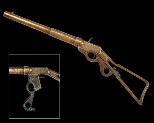 19 3/4in. two stage barrel marked 'S. EGGERS. N. BEDFORD MASS PAT. FEB.12.1878.', chambered for the Winchester 8-bore blank cartridge, underlever falling block with Ebenezer Pierce and Selmar Eggers patent breech block locking device, U.S. patent No. 200,338, the rear of the triggerguard with stud extending through skeletal stock, locked in place with a pivoting lever on the stock, weight 22lb. 13oz.