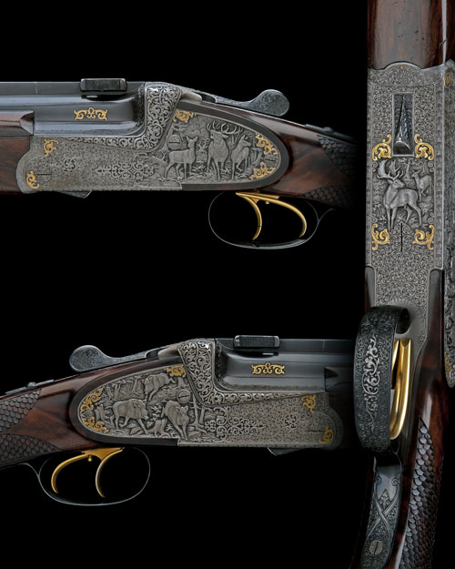 24 3/4in. nitro barrels with matt sight rib with open sights, ramp-mounted bead fore-sight, the breech end with gold scroll details and mounted with a Zeiss Diavari-Z 1,5...6x42 telescopic sight in quickly-detachable mounts, three-piece fore-end, quadruple-grip action with side-bolsters, toplever gold-inlaid 'LUD. BOROVNIK. FERLACH' and the top of the standing breech gold-inlaid with a fleur de lys, automatic safety, removable striker discs, gold-washed triggers, the front a set trigger, finely engraved and heavily chiselled with stylised acanthus scrollwork, surrounding woodland scenes of wild boar, red deer and fallow deer, with occasional gold highlights, old silver finish, 14 1/2in. highly-figured pistolgrip stock with sculpted cheekpiece, fishscale chequering, engraved and monogrammed pistolgrip-cap, sling swivels, horn buttplate, weight 9lb. 8oz., in its brass-cornered claret leather, blue velveteen lined case with provision for the telescopic sight