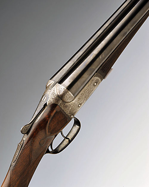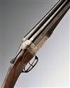 25 3/4in. nitro reproved barrels, 2 1/2in. chambers, bored approx. 1/4 and 3/4 choke, treble-grip action, automatic safety with inlaid 'SAFE' detail, border and acanthus scroll engraving, 15in. figured stock cast off for central vision, weight 6lb. 3oz.