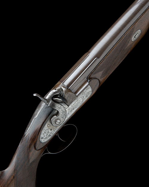 circa 1850, with possibly shortened 41 1/4in. re-browned twist barrel, large brass bead fore-sight, short sighting rib at breech, squared patent breech, borderline engraved top-tang, flat borderline engraved bar-action lockplate signed 'D. WALES, GT. YARMOUTH', borderline engraved hammer, walnut chequered half pistol-grip half-stock, iron furniture, white-metal oval escutcheon to underside of stock, horn fore-end tip, iron under-barrel rib and probable original rammer