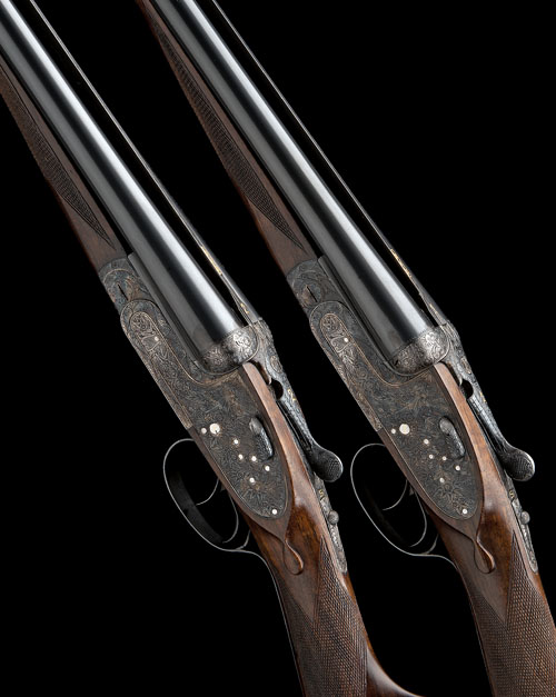 25in. nitro chopperlump barrels with raised matt Churchill-ribs, gold-inlaid with 'AYA' and '1' and '2' at the breech ends, 2 3/4in. chambers, bored approx. imp. cyl. in all, toplevers gold-inlaid '1' and '2', automatic safeties, removable striker discs, hand-detachable lockplates, gold-inlaid cocking-indicators, articulated front triggers, rolled-edge triggerguards, fully engraved with floral and acanthus scroll motifs, retaining much original colour-hardening and finish, 14 5/8in. figured stocks, weight 6lb. 1oz., in a leather motor case