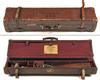 29in. replacement nitro chopperlump barrels (by the makers in 1936), the ribs gold-inlaid '1' and '2' at the breech ends, 2 1/2in. chambers, bored approx. imp. cyl. and 1/2 choke (No.1) imp. cyl. and 1/4 choke (No.2), toplevers gold-inlaid '1' and '2', automatic safeties with gold-inlaid 'SAFE' details, gold-inlaid cocking-indicators, rolled-edge triggerguards, best fine bouquet and scroll engraving, 15in. figured stocks (No.2 a replacement, No.1 fore-end with insert repairs to tip), the stocks with two gold escutcheons engraved 'JHD' and '1905 GPD 1955' respectively, weight 6lb. 11oz. (both), in their leather double motorcase