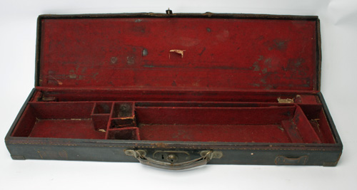 A BRASS CORNERED SINGLE LEATHER GUNCASE, suitable for 28in barrels (could adjust to 30in. barrels), lined with maroon baize, brass lock (key missing)