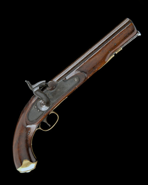 circa 1840, with round 9in. barrel, makers mark 'W.A.' and Tower proofs at breech, solid rounded top-tang, plain borderline engraved lock, plain walnut full-stock stamped 'W.A.' into the grip, brass furniture including winged butt-cap, trigger-guard, serpentine sideplate and ramrod pipe, Iron ramrod