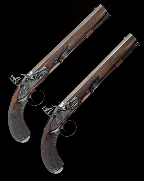 circa 1801, with re-browned 10in. octagonal rifled barrels, the top-flats signed in gold 'MANTON, LONDON', silver fore-sight, dove-tailed notch rear-sight, twin gold lines at breech, gold lined touch-hole, flat, border engraved locks signed 'MANTON' (colour renewed), sliding safes behind the hammers, roller bearings to the frizzen springs, walnut half-stocks with chequered bag-shaped grips, silver oval escutcheons to the wrists engraved with a serpent emerging from a crown, engraved iron trigger-guards and finials, applied under-ribs and original wood rammers with horn tips