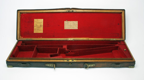 JAMES PURDEY AND SONS A BRASS-CORNERED OAK AND LEATHER SINGLE HAMMERGUN CASE,