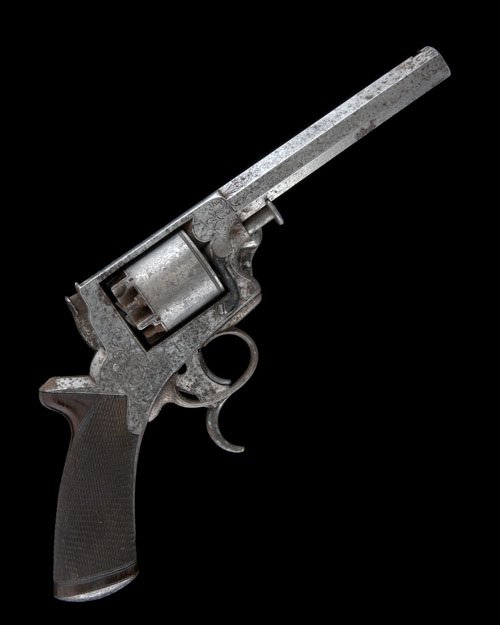 third model circa 1860, with octagonal 6in. barrel, dove-tail provision for fore-sight (missing), standing notch on the rear of top-strap, the top-strap signed 'H. RICHARDS OLD HALL ST LIVERPOOL', engraved band at muzzle, scroll engraved at breech, borderline and scroll engraved frame (action frozen) with 'Y' shaped spring safety, plain cylinder with borderline engraving and rope-turned front edge, spur-less hammer, walnut chequered one-piece grip, secondary cocking trigger protruding through trigger guard and hinged rammer mounted on left hand side of barrel, the whole stripped of finish with some pitting