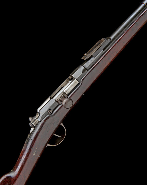 dated for 1884, with 32 1/2in. sighted barrel, octagonal receiver signed by the maker and marked 'MLE 1874' and 'M80', straight bolt, plain walnut three-quarter stock with iron furniture, two barrel-bands and an iron nose-cap together with an iron cleaning rod