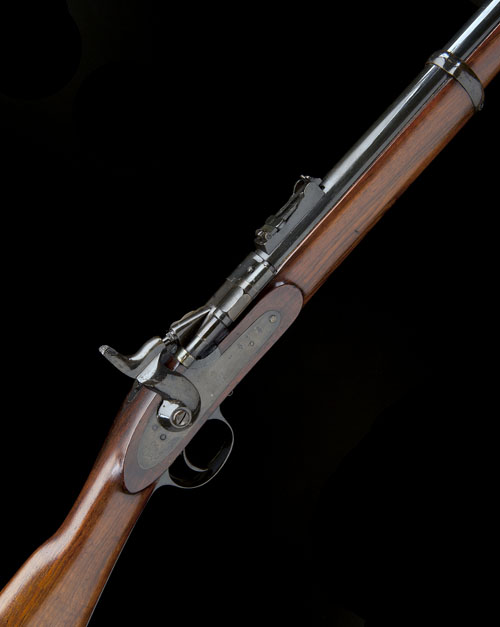 dated for 1871, with 30 1/2in. barrel, block and blade fore-sight, elevating ladder rear-sight, hinged 'flip-open' breech-block with locking catch and pull-back extractor, military-style border-lined lock with the date together with a 'VR' crown cypher, plain three-quarter walnut military style stock with iron furniture, bayonet lug to right hand side of muzzle, iron ramrod, all exposed iron surfaces covered in a preservative laquer