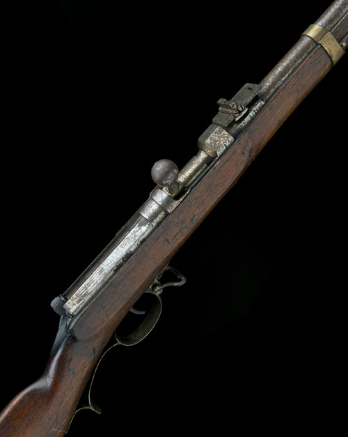 dated for 1867, with 33in. barrel, block and blade fore-sight, standing notch rear-sight with two large folding leaves, part octagonal receiver with bolt action opening (mainspring missing), walnut three-quarter stock with brass furniture except iron heel-plate and under-barrel iron clearing rod, exposed iron surfaces stained and lightly corroded