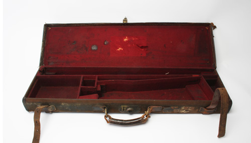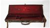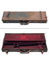 A CANVAS & LEATHER SINGLE GUNCASE, 30in. barrels, lined with maroon baize, brass lock (key missing),